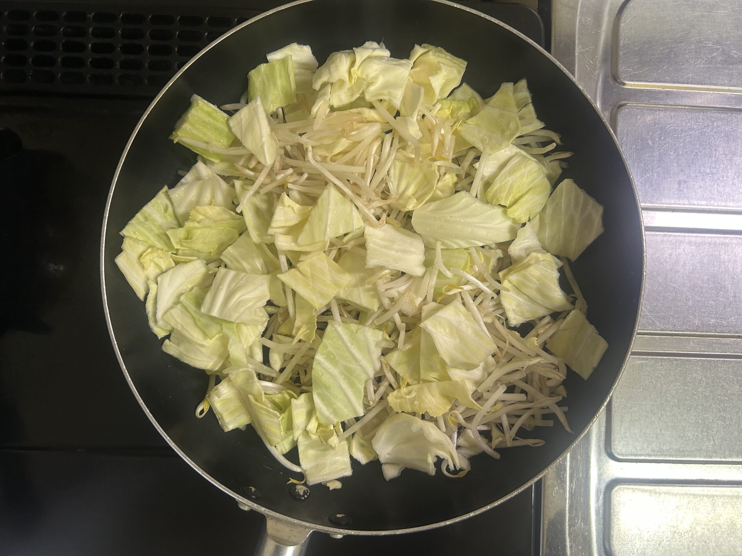 ①もやしとキャベツをフライパンの底に並べる
