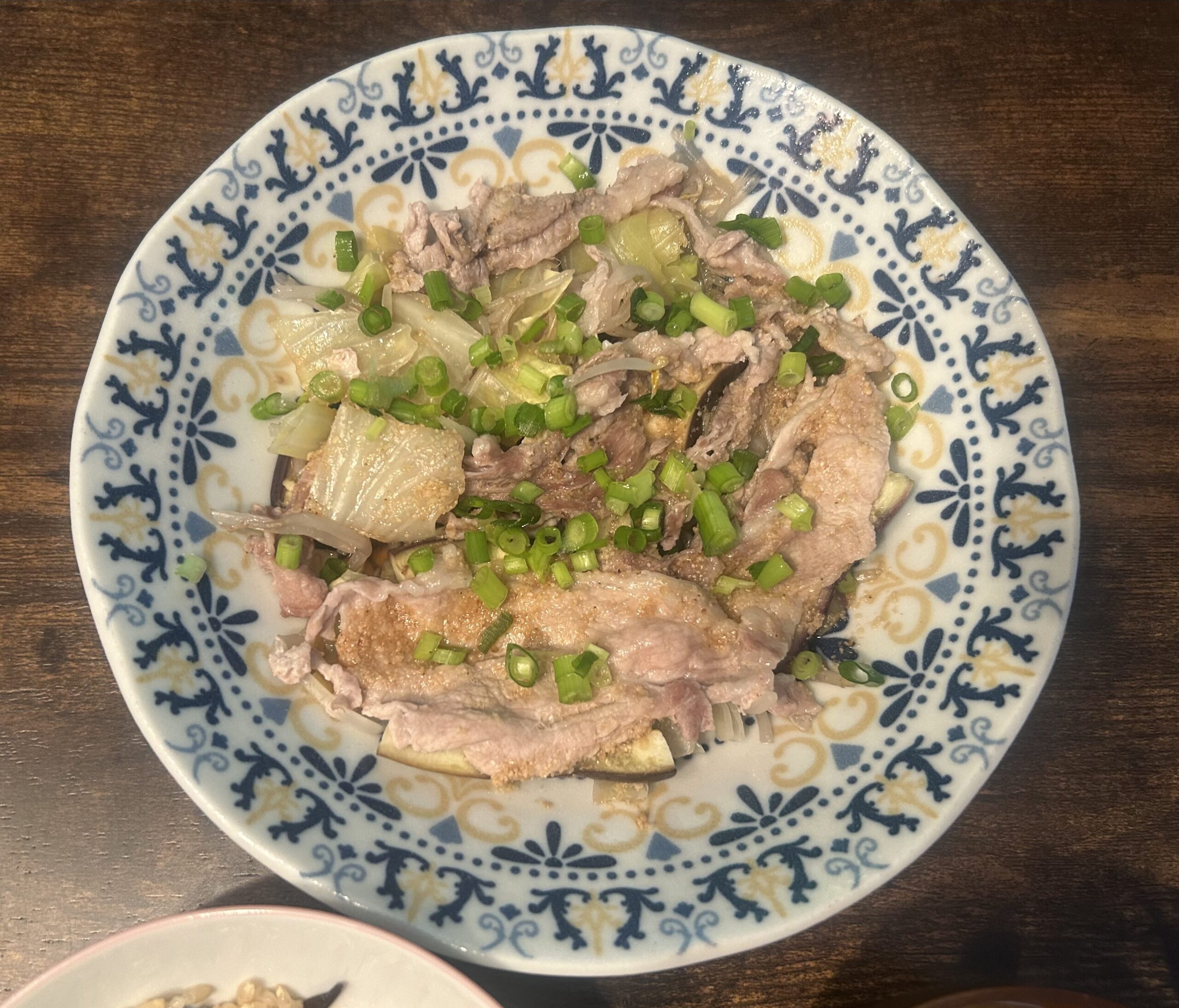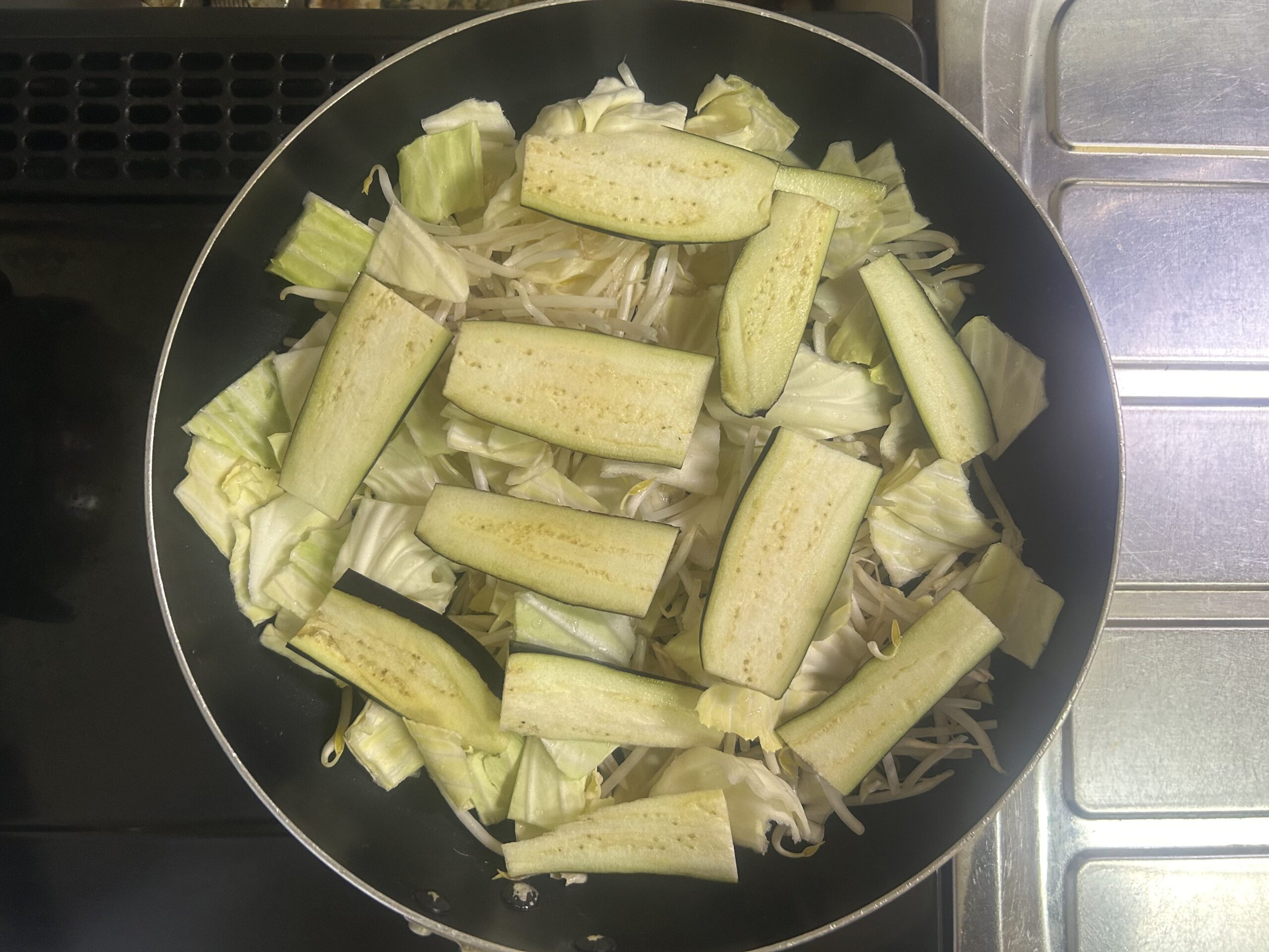 ・キャベツ、もやし、茄子、豚肉の蒸し料理